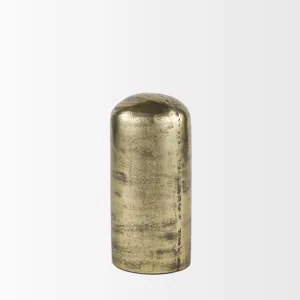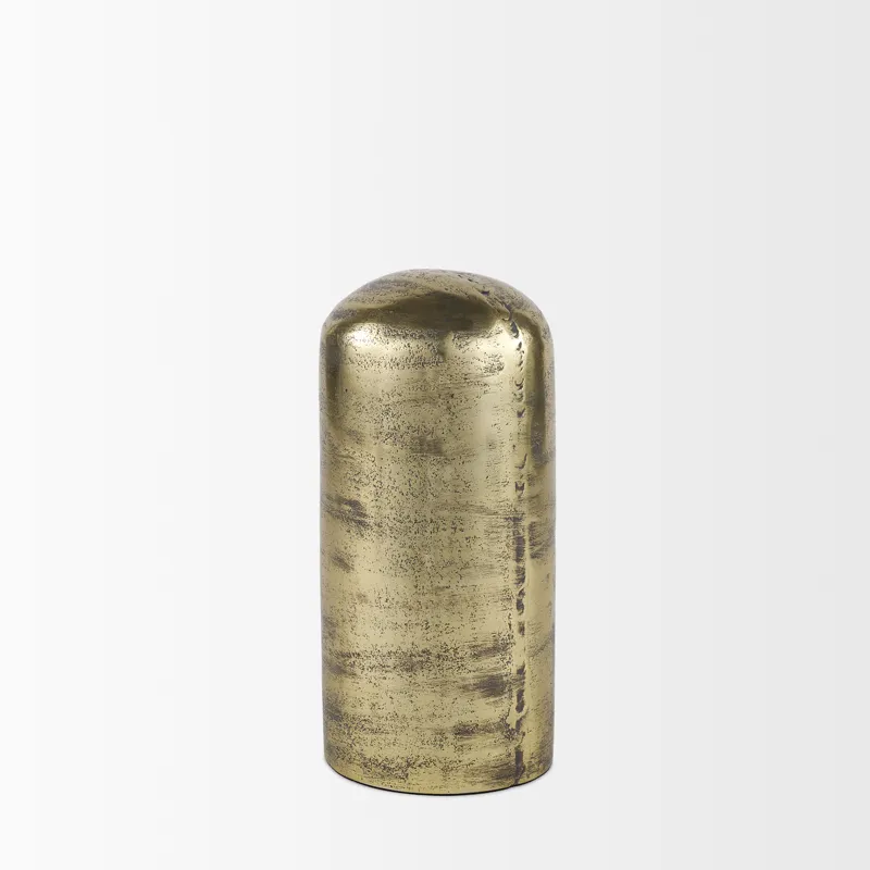 The Quonset is a pillar-style decorative accent that is made of cast aluminum and electroplated with an antiqued brass finish. Use alone or layer with the Quonset Short and Extra Tall for added depth.Â