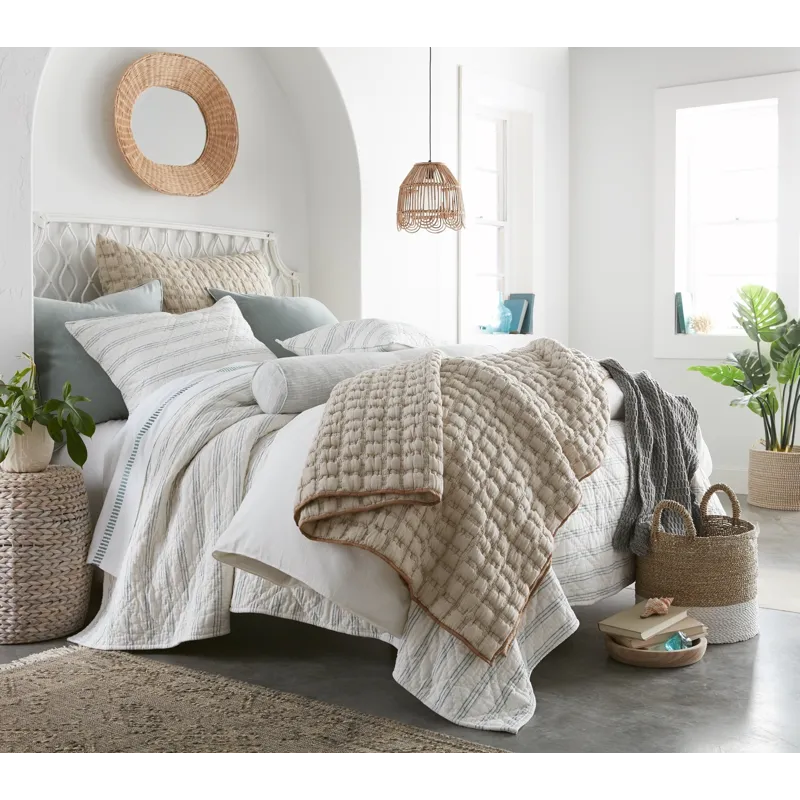 Bound with a striking contrast flange, this quilt transcends the ordinary, adding a bold and stylish edge to its inviting softness. The combination of fluffy blocks and the eye-catching flange creates a visually dynamic quilt that effortlessly becomes the focal point of any bedroom. Shams are finished with a knife edge style without a flange