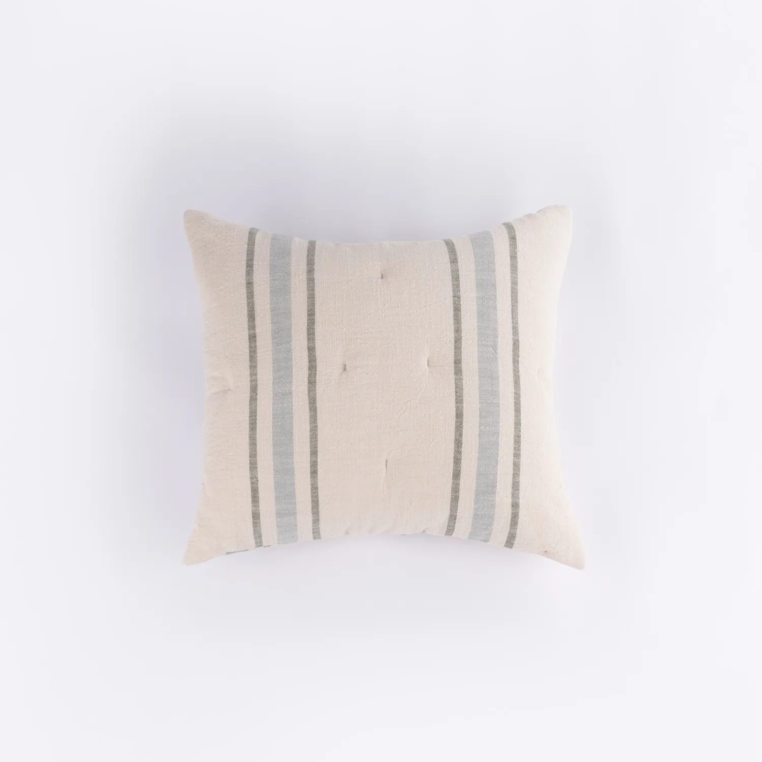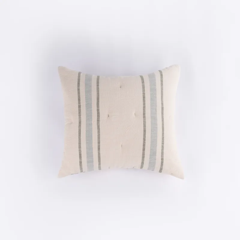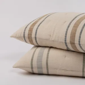This yarn-dyed stripe pairs two sophisticated colors in a classic mirrored stripe. Constructed of a plush cotton yarn with slubs in the warp and weft, this fabric has ample texture with a soft hand. The lofty fill is tacked in a rhythmic pattern in the ivory spaces to add texture to the overall design. Shams have a hidden zipper closure and are quilted on both sides.