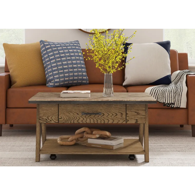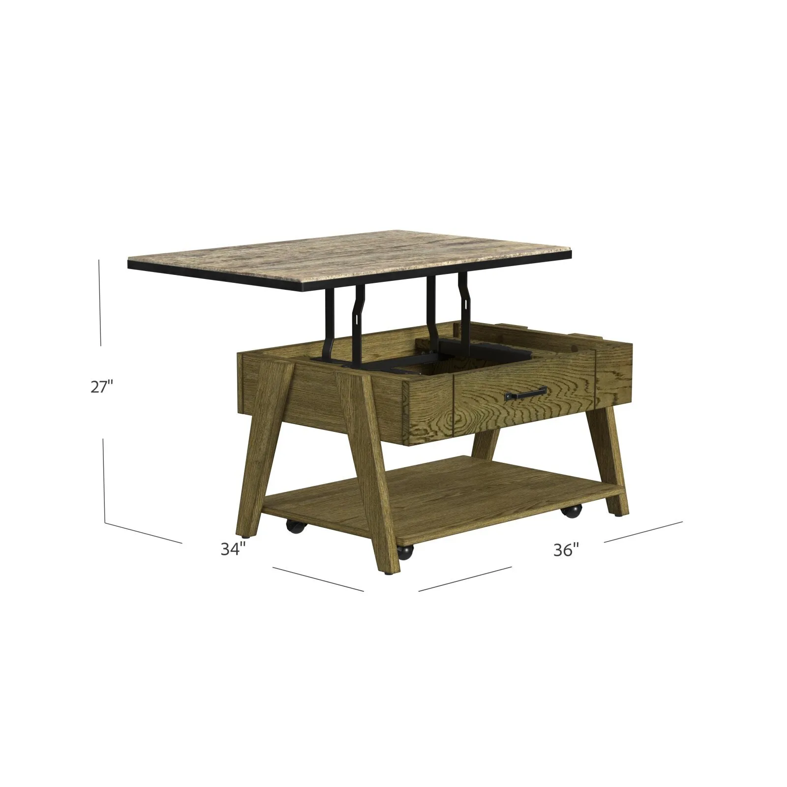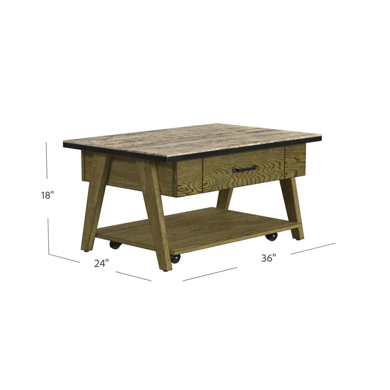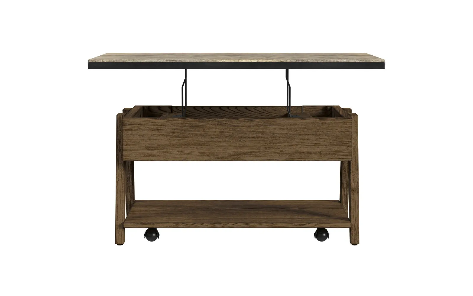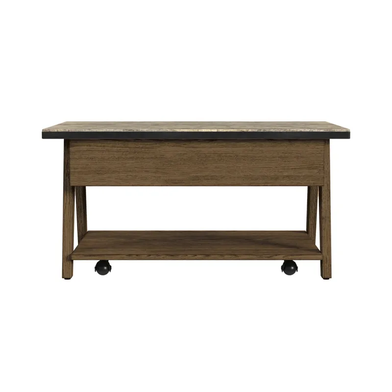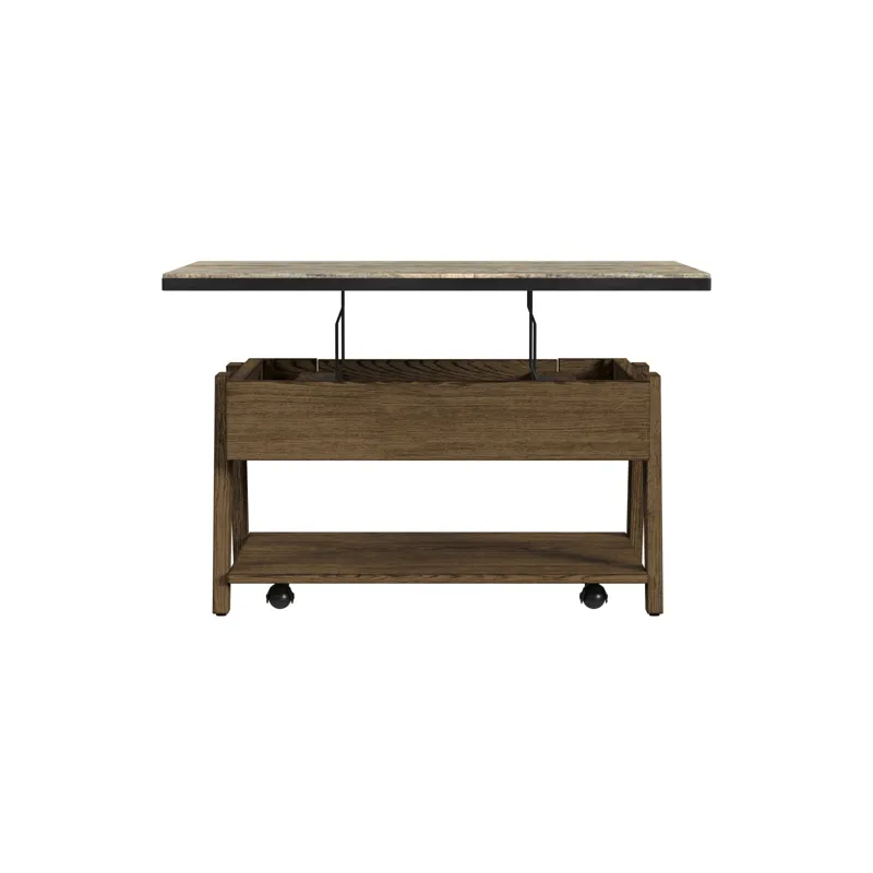 Discover urban sophistication with the Oak Park Collection's Natural Oak Wood Lift-Top Cocktail Table. This stunning centerpiece boasts a modern industrial design, featuring a metal-framed laminate top and angled legs that exude character and charm. With its lift-top mechanism, hidden storage under the lifted top, and convenient bottom shelf, this table offers both style and functionality. Effortlessly mobile thanks to its casters, it seamlessly blends contemporary flair with rustic appeal. Crafted from white oak solids and veneers, the natural finishes add depth, with the base in a natural oak tone and the top in a multi-toned rustic oak laminate. Complete with decorative bar pulls in a dark antiqued finish, this cocktail table is a perfect addition to any living space, adding a touch of modern elegance to your home decor.