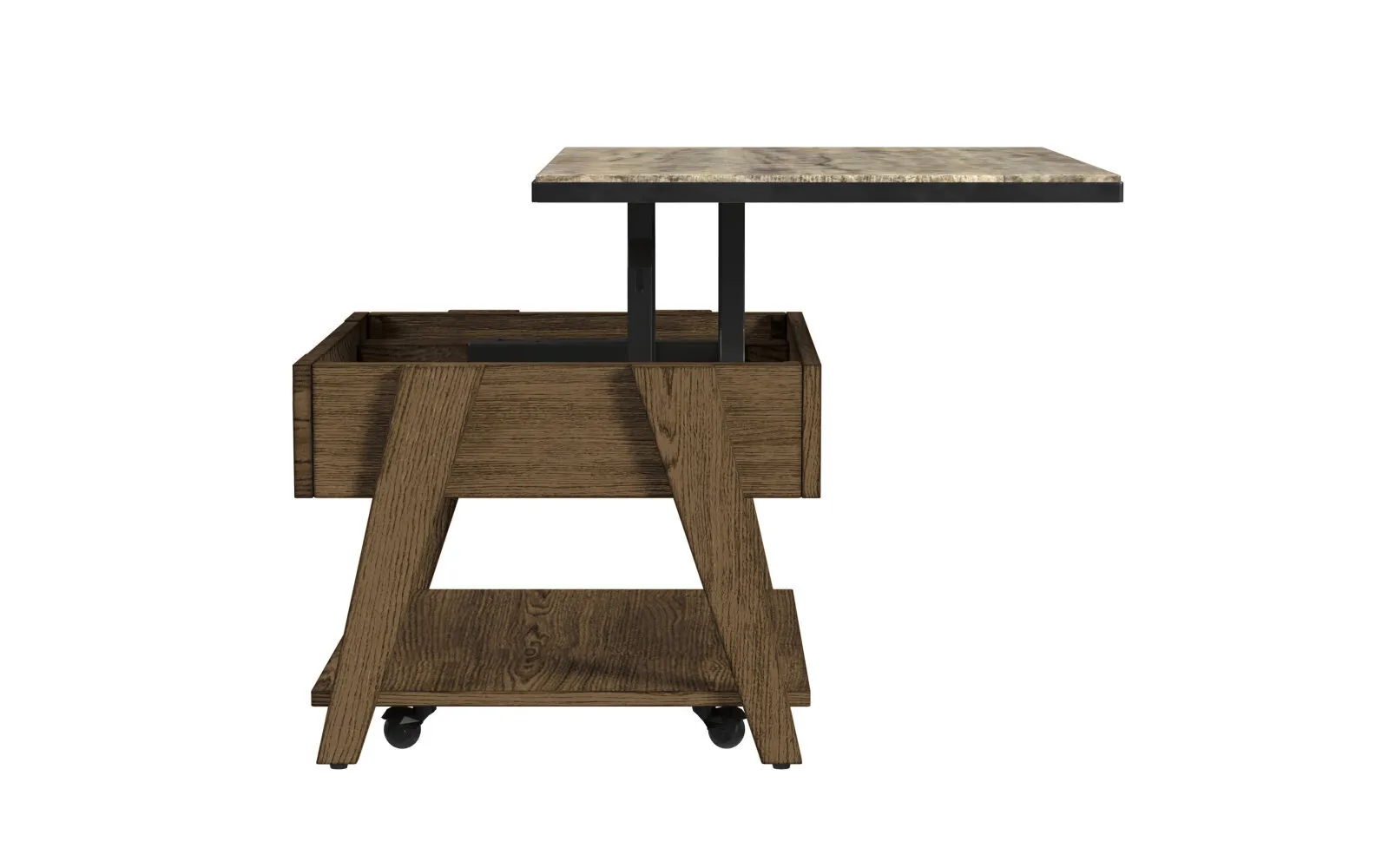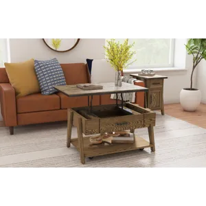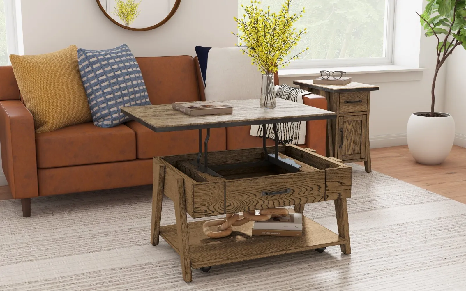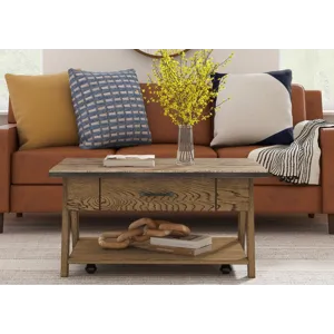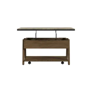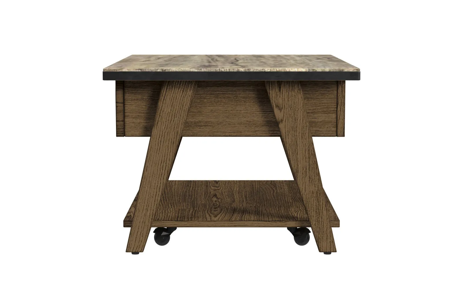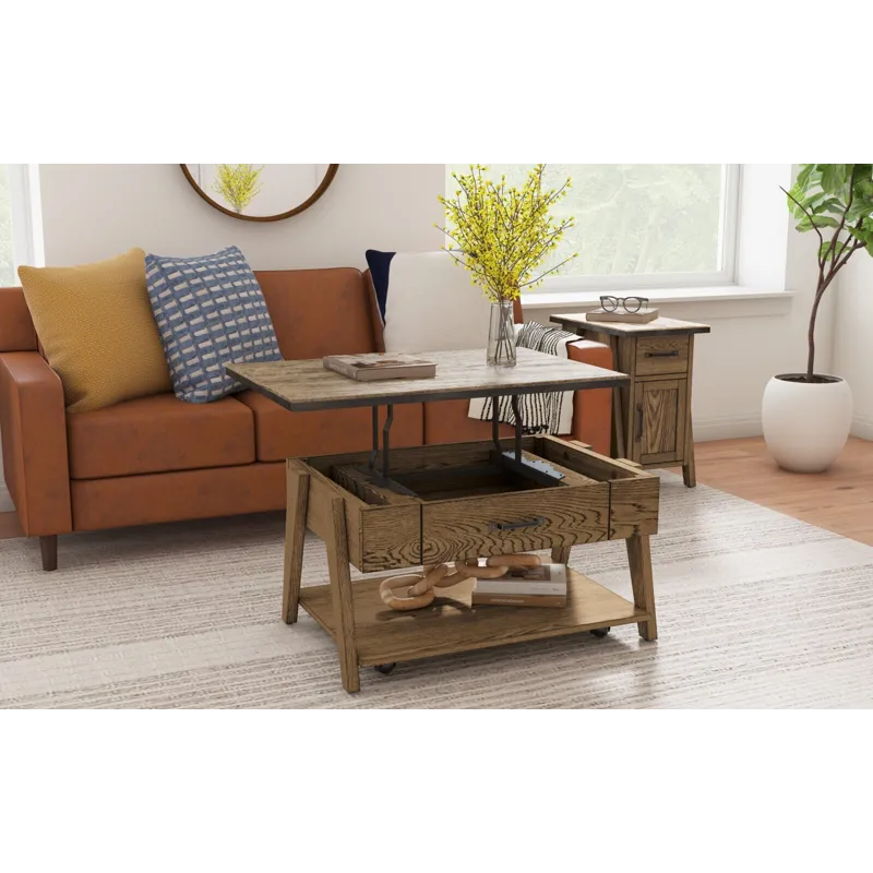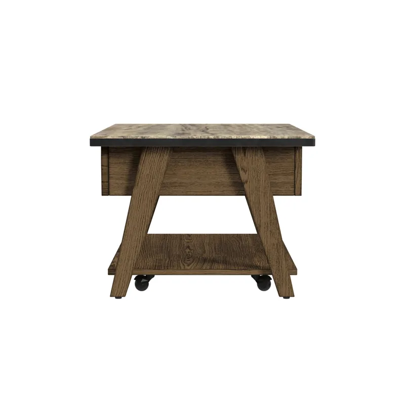 Discover urban sophistication with the Oak Park Collection's Natural Oak Wood Lift-Top Cocktail Table. This stunning centerpiece boasts a modern industrial design, featuring a metal-framed laminate top and angled legs that exude character and charm. With its lift-top mechanism, hidden storage under the lifted top, and convenient bottom shelf, this table offers both style and functionality. Effortlessly mobile thanks to its casters, it seamlessly blends contemporary flair with rustic appeal. Crafted from white oak solids and veneers, the natural finishes add depth, with the base in a natural oak tone and the top in a multi-toned rustic oak laminate. Complete with decorative bar pulls in a dark antiqued finish, this cocktail table is a perfect addition to any living space, adding a touch of modern elegance to your home decor.