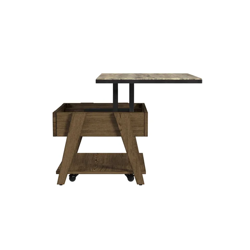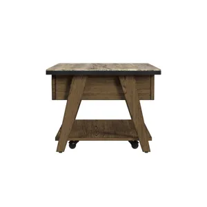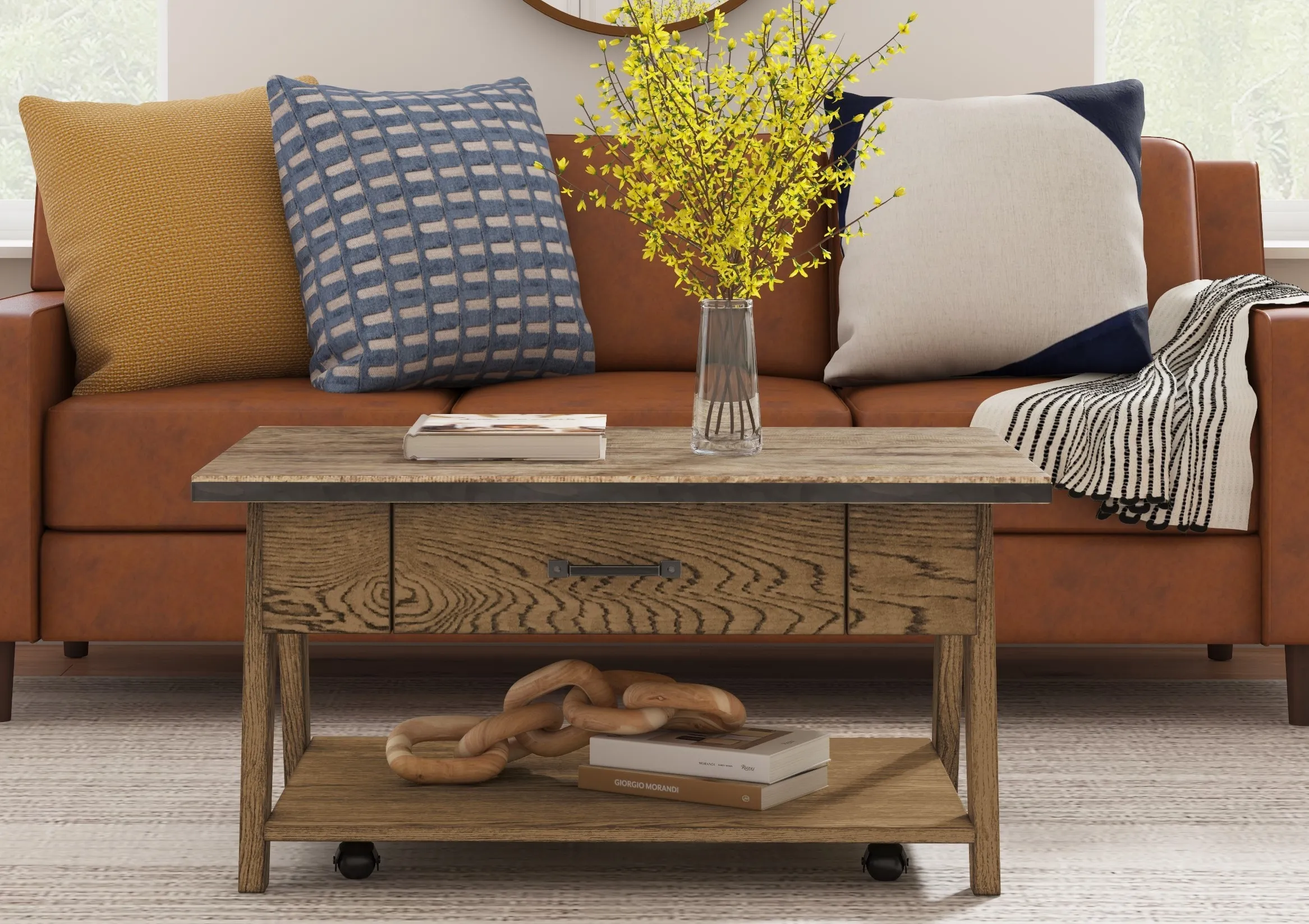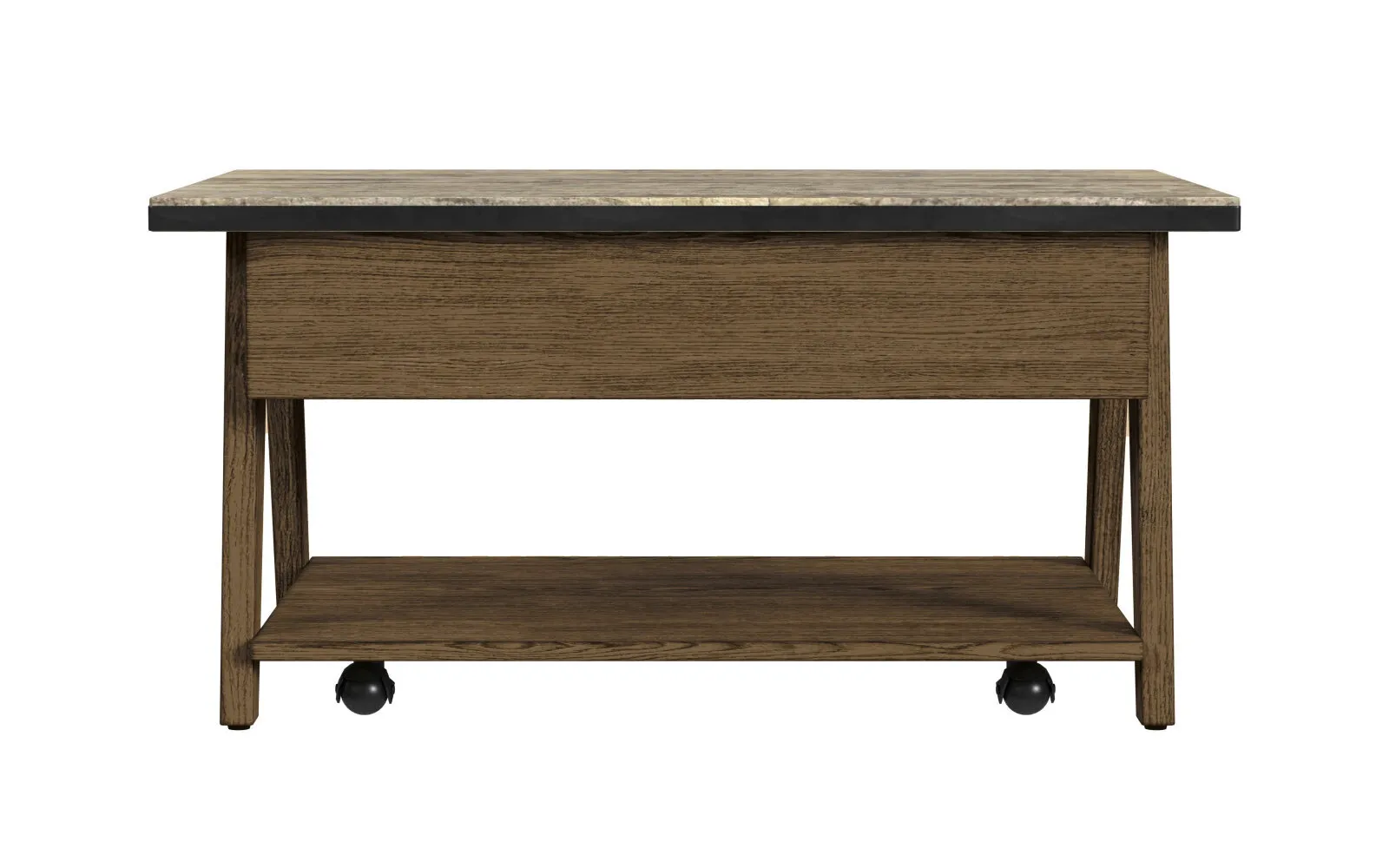 - Elegant Details: Two-tone finish: Natural Oak base and Rustic Oak high-pressure laminate lift-top with dark antiqued metal trim and hardware.